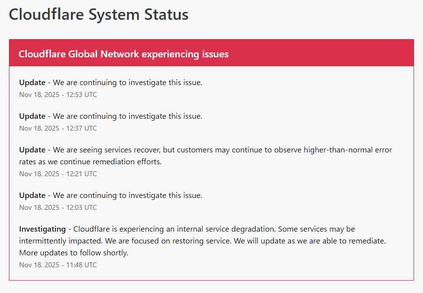 障害は11月18日の20時台から発生しており、Cloudflareの公式ステータスページでも「問題を確認し、調査中」とアナウンスされています。